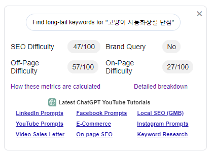 우측의 제일 상단에 나오는 데이터인데, "find 롱테일 키워드" 클릭시 자동추출 해서 롱테일 키워드를 뽑아냅니다. 그밖에 박스 하단의 "breakdown" 을 클릭시에는 자세한 관련 사이트들의 리스트와 정보가 나오게 됩니다.