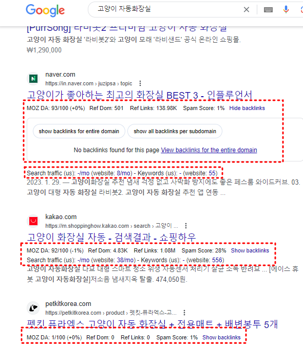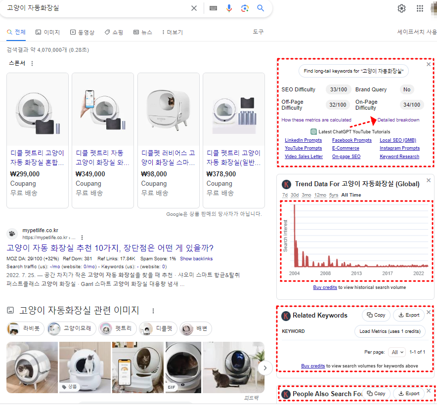 사실은 무료로 이용하시는 경우에는 정확하게 CPC 단가를 알수 없습니다. CPC단가를 알기 위해서는 유료로 사용하시는 것을 추천드리지만, 이는 무료로 충분히 프로그램 사용해 보시고 난 이후에 사용하시는 것을 추천 드립니다. 분명한 장점으 적어도 키워드에 대한 인사이트를 항상 가져갈 수 있다는 점입니다. 검색창에서 항상 우측에는 이러한 키워드에 대한 개략적인 정보들이 뜨게 되고 , 키워드의 트렌드를 짐작 할 수 있으며 검색으로 뜨는 아래 사이트들에 대한 기본적인 지수등에 대한 분석이 나타나게 됩니다.