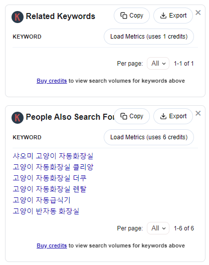 아래에 볼륨이 표시되는 웹 사이트 에서는 하나의 크레딧만 사용됨 - 관련 항목, 사람들이 함께 검색하는 항목 , 롱테일 키워드 위젯이 표시되는 모든 키워드에 대해 1크레딧이 사용.