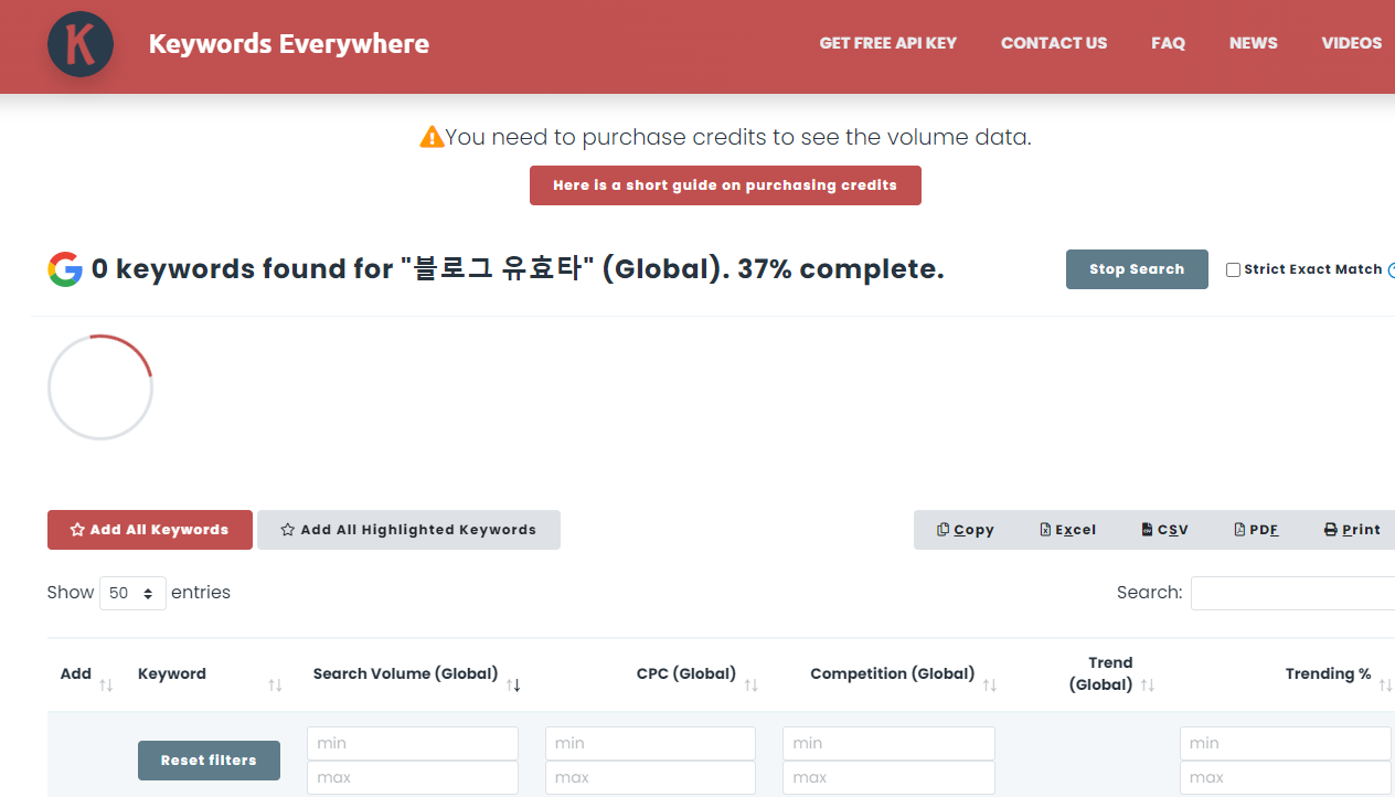 - 단일 키워드에 대한 볼륨 데이터를 가져올 경우마다 1 크레딧 사용 , 하나의 키워드만 입력하고 검색 표시줄