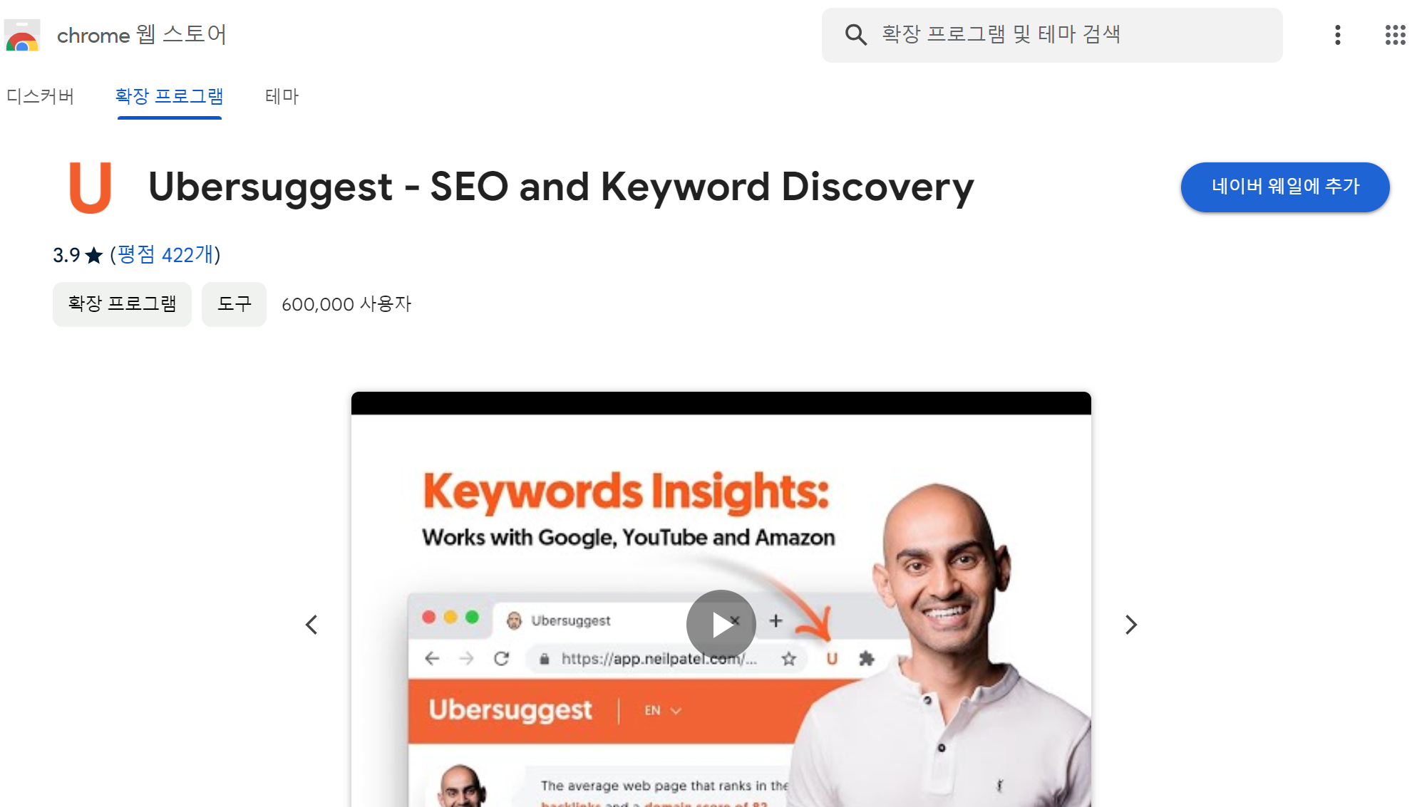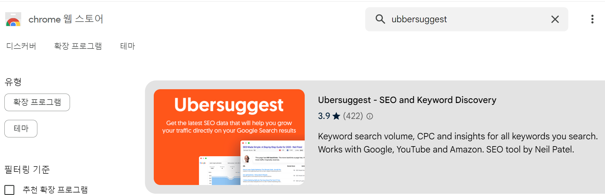 2 웹스토어에서 Ubersuggest를 검색하세요. 한국어로 검색하면 나오지 않습니다. 아래 이미지에서 UberSergest를 클릭하세요.