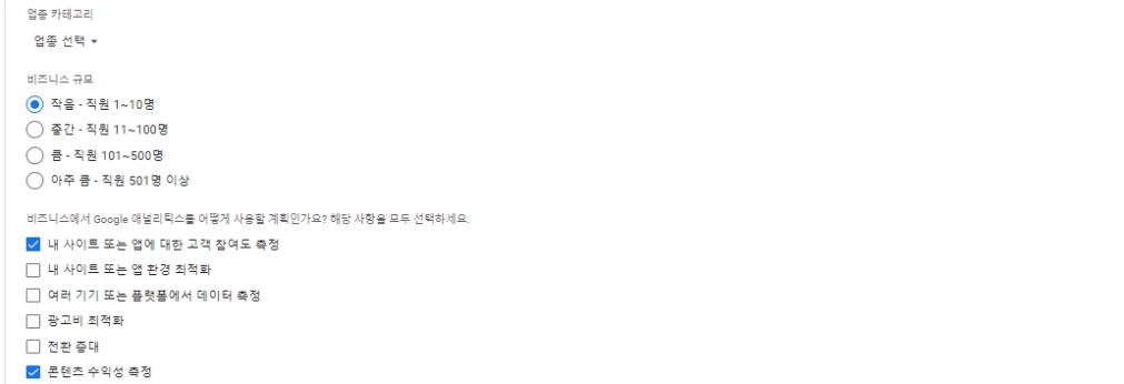 여기서는 비즈니스 규모를 입력하게 되는데 , 대체적으로 개인분들이 운영하시는 경우 대략적으로 '작은규모'기준으로 입력해 주시고 , 고객 참여도 측정 여부와 콘텐츠 수익성 측정 기준으로 사용할 계획이라고 한다면 죌 것 입니다.