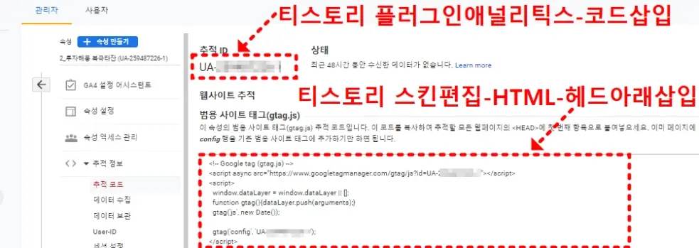 이 추적ID 에 나와있는 'UA-XX ~ ' 번호를 마우스로 복사 하셔서 티스토리 플러그인을 통해서 입력 연결을 해주실 것이고, 아래 웹사이트 추적을 위한 전용태그는 복사하여서 티스토리 관리자화면에서 메뉴편집에서 '꾸미기-스킨편집'에서 작업해 주시면 됩니다.