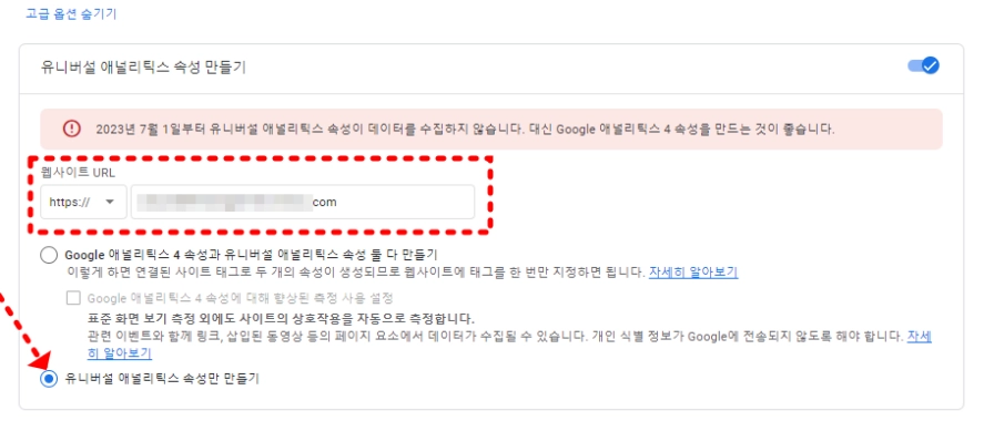 아래의 경우에는 "고급 옵션 보기" 로 들어가셔서 설정 하시는 화면의 예시 입니다. 블로그 주소를 입력해 주시고 , "유니버셜 애널리틱스 속성만 만들기"를 클릭 하시면 됩니다.
