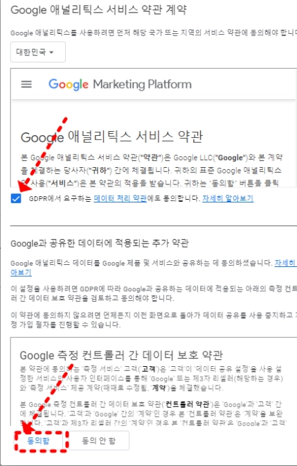 다음으로 구글 애널리틱스 서비스 약관계정 약관창이 뜨게 되면 , "동의함"을 클릭 해주시고 확인을 진행 하시면 됩니다. 이렇게 하면 구글 애널리틱스 추적코드 , 추적ID가 생성되게 됩니다.