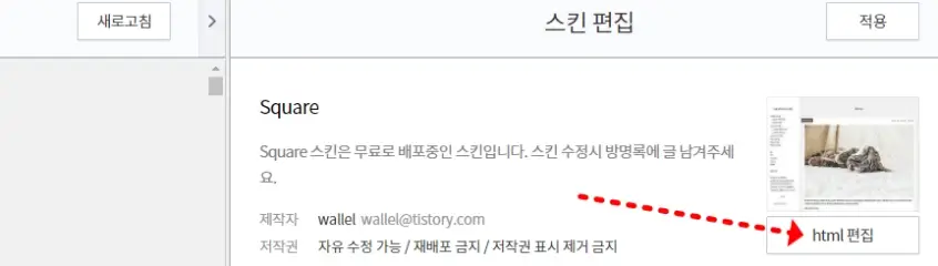 이렇게 하고 나면 이제 '관리자-꾸미기-스킨편집'으로 들어가셔서 HTML코드를 삽입하는 작업을 하면 됩니다.