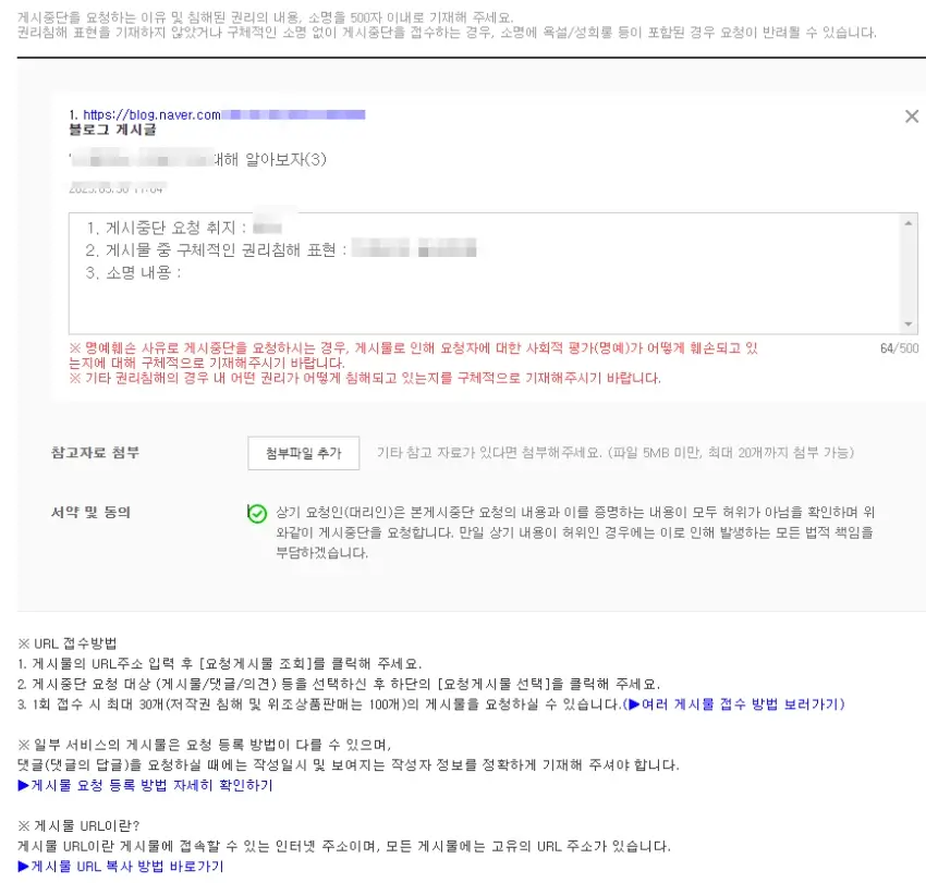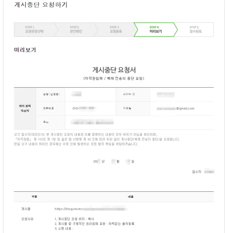게시중단 요청서 를 통해서 잘못 접수된 부분이 없는지 확인을 하시고 이메일, 연락처, 주소등을 확인한후 추가 첨부자료나 참고자료 첨부할 것을 최대한 첨부해 주시고 , 게시중단 요청에 대한 서약과 동의를 최종 확인 하신이후에 제출하면 접수가 완료가 됩니다.