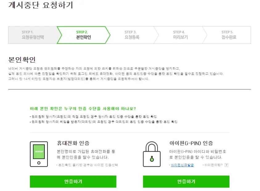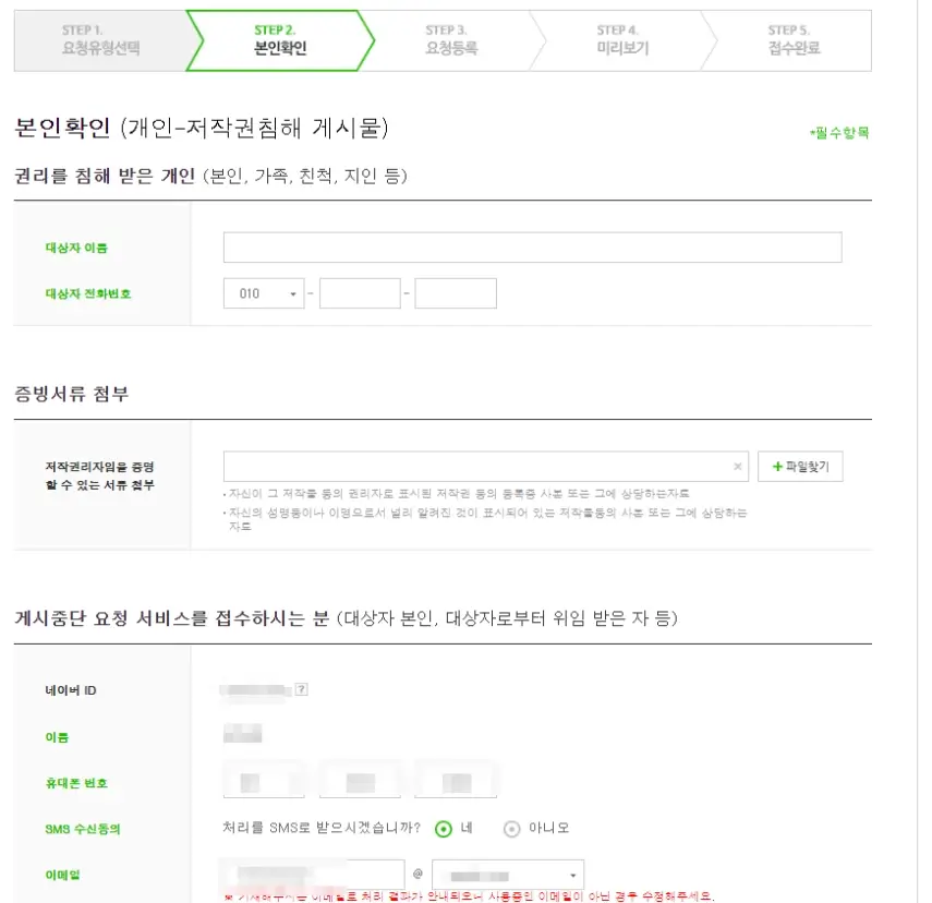 세번째로는 일반적인 개인 신분 확인으로 휴대폰이나 아이핀 인증 , 권리소명 자료로 저작권을 소명할 수 있는 자료등을 필요서류로 접수 하여야 합니다. 핸드폰으로 본인 인증을 하시면 본격적인 본인확인 정보로 이름, 전화번호, 증빙서류 , 게시중단 요청 서비스 접수하는 사람의 주소, 이메일등을 등록 합니다.
