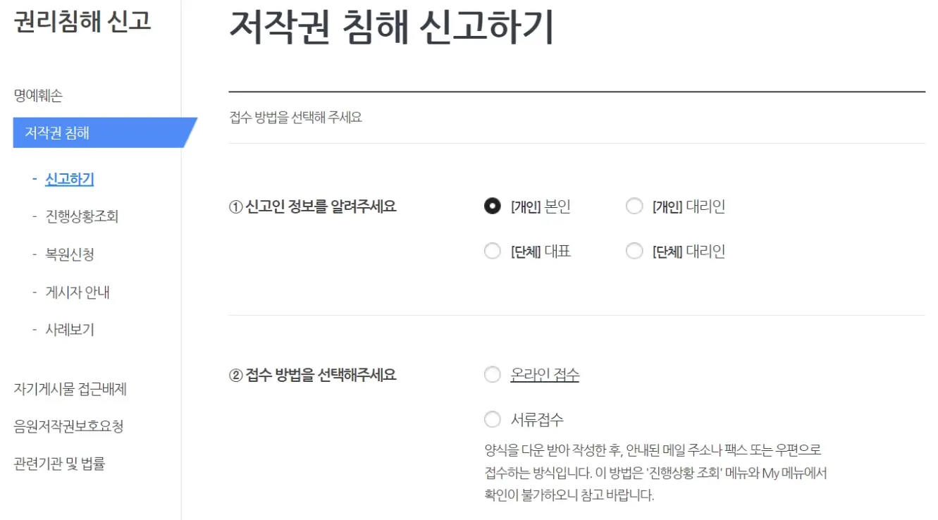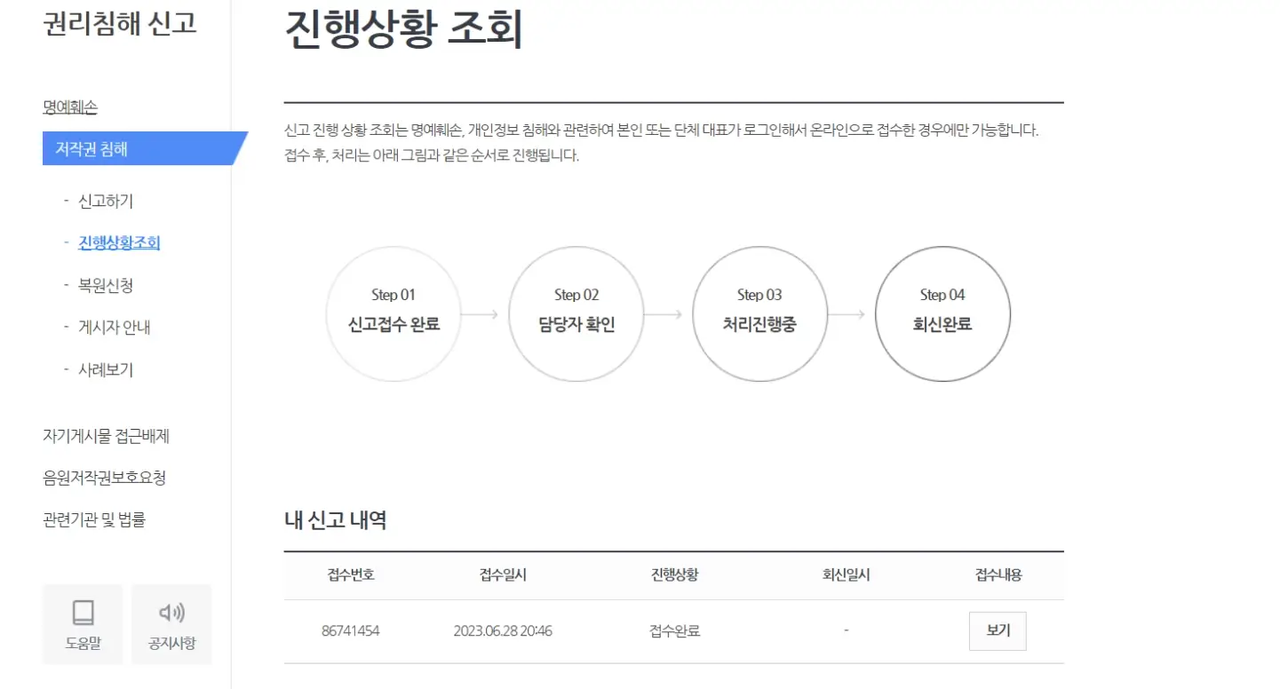 순서대로 진행하실수 있는데요. 우선 본인 확인을 진행을 하시고 후에 신고와 접수를 진행하게 됩니다. 신고할 주소 및 본인 글 주소 및 본인이 직접 창작물의 원 저작권자라는 것을 입증하는 캡쳐나 관리자 화면, 서류들을 첨부해 주어야 합니다.