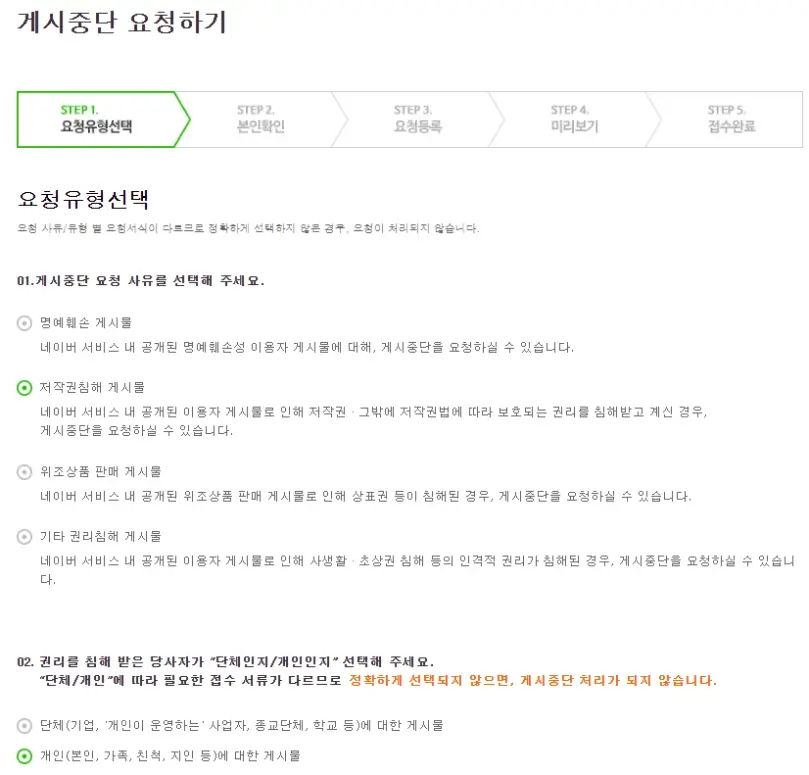 명예훼손 사유의 게시물인지 , 저작권침해 게시물 인지 , 위조상품 판매 게시물인지나 또는 기타 권리침해 게시물 여부를 확인해서 선택을 하게 되는데요. 권리침해 에는 초상권 침해나 사생활 침해 정도의 내용으로 게시중단을 요청 하실수 있습니다. 가장 일반적인 경우는 블로그 컨텐츠에 대한 저작권 침해 신고라고 본다면 "저작권침해 게시물" 과 두번째 선택사항은 "개인" 인지 "단체"인지 여부를 선택하는 것입니다.