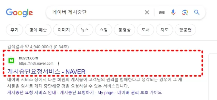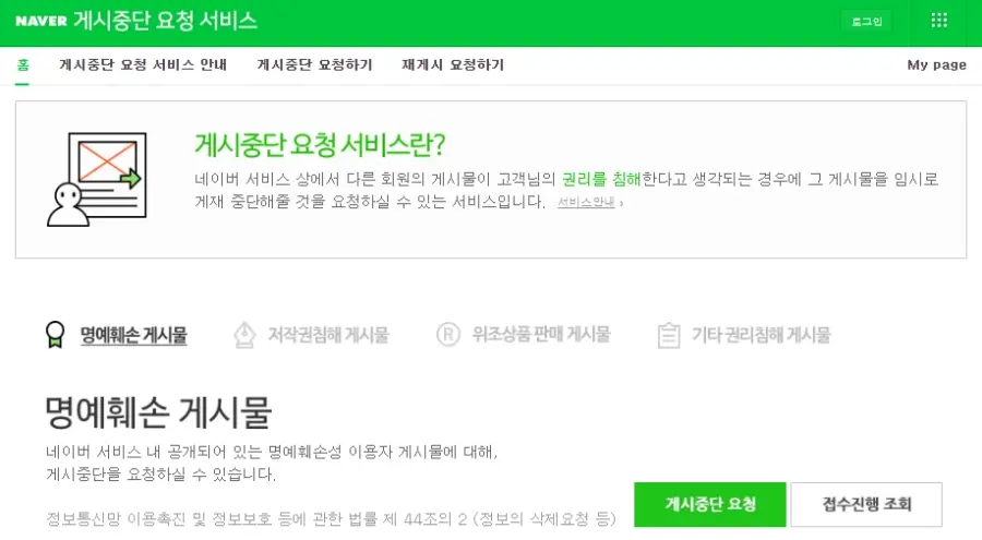 우선 네이버 게시중단 요청 서비스 를 찾아서 들어가 봅니다. 여기에는 요청 유형이 4가지 정도로 나타 납니다.