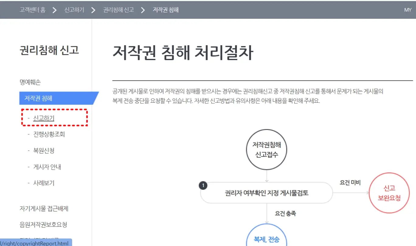 중앙 아래에 있는 메뉴 '저작권 침해신고' 로 들어가 봅니다.