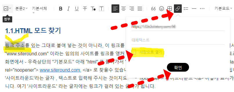 이 작업을 위해서 HTML 모드로 들어가서 target="_blank"라는 새창열기 코드링크를 지워 주실 수도 있습니다.