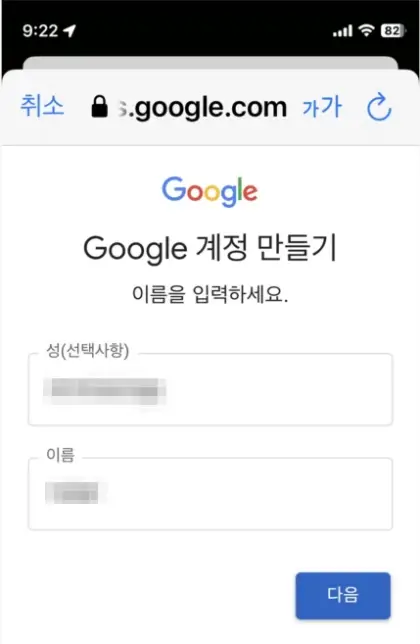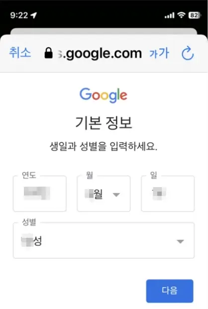 다음으로 임의로 성과 이름을 입력하고 , 생일과 성별을 임의로 입력하면 됩니다.