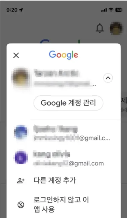 우선 모바일 핸드폰으로 지메일을 무한생성하는 방법을 말씀드리겠습니다. 핸드폰에서 우선 '구글'에서 보시면 우측상단에 내계정 아이콘을 클릭 합니다. 그러면 화면이 뜨는데 , 상단 이메일 우측에 "v" 모양의 클릭버튼이 있는데, 이것을 클릭해 봅니다. 아래에 내가 폰에서 등록해놓은 계정들이 뜨고, 제일 아래 "다른 계정 추가" 라는 새로운 계정을 추가할수 있는 사람 모양을 클릭해 봅니다.