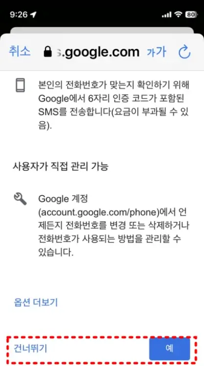 다음으로 전화번호를 입력하라고 나오는데요. 개인정보 전화번호를 입력하시는 경우 다계정을 생성시키시는데 문제가 될수있기 때문에 전화번호 입력은 "건너뛰기"로 "예"를 클릭 하시고 넘어 갑니다.