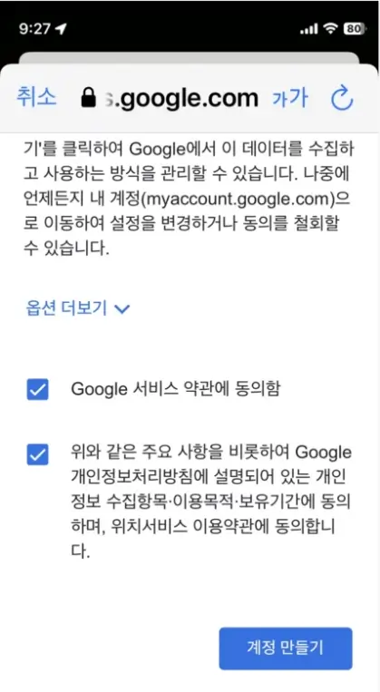 마지막으로 계정확인을 하시고 , 약관동의를 거쳐서 최종적으로 "계정 만들기"를 클릭하여서 계정을 만들어 주면 끝이 납니다.