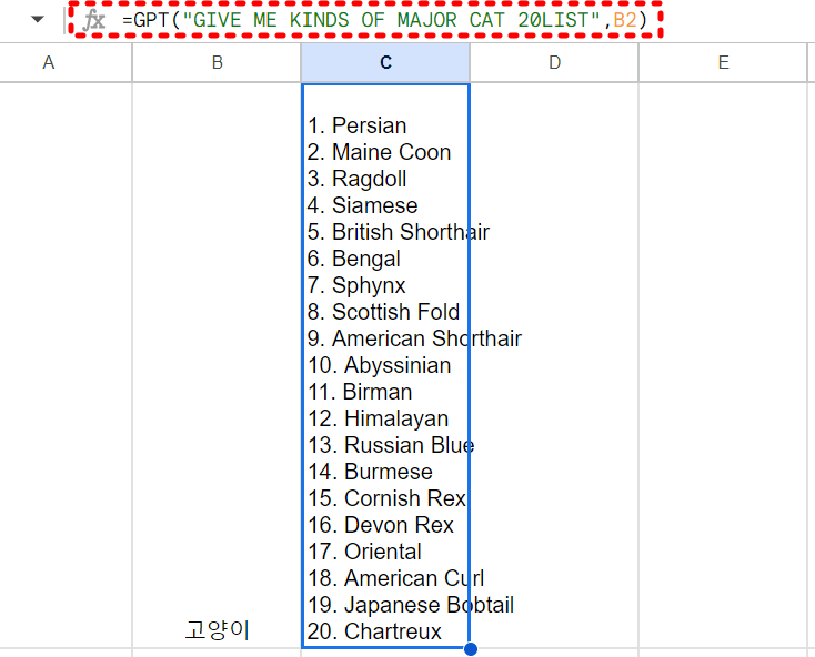 가장 기본적인 챗GPT에 요청하는 함수는 = GPT(기본 프롬프트, 추가 프롬프트)를 입력 합니다. 여기서 기본 프롬프트는 요구하는 명령사항을 적고 , 추가프롬프트에는 지시하는 항목의 셀위치를 입력해 주면 될것입니다. 예를 들어 , A열에 '고양이'를 넣고, B열에 요청하는 함수를 넣되 , 기본 프롬프트에는 "