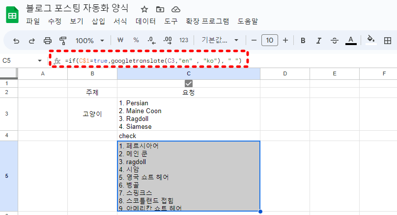=GOOGLETRANSLATE( A2, "KO" , "EN")를 "영어제목"란에 입력해 주면 됩니다. 예제를 해보면 아래와 같습니다.