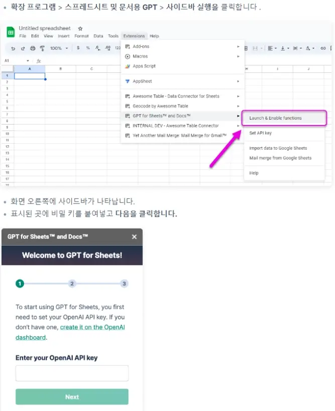 GPT for sheets and docs 프로그램- 확장프로그램 - 부가기능 - 부가기능 설치하기 - 로 들어가셔서 입력 하시면 됩니다.