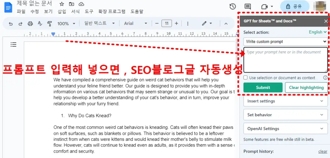 구글독스 화면에서 챗GPT 블로그글 생성