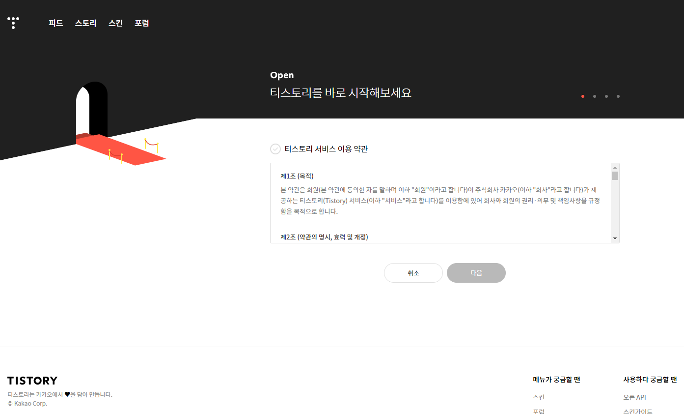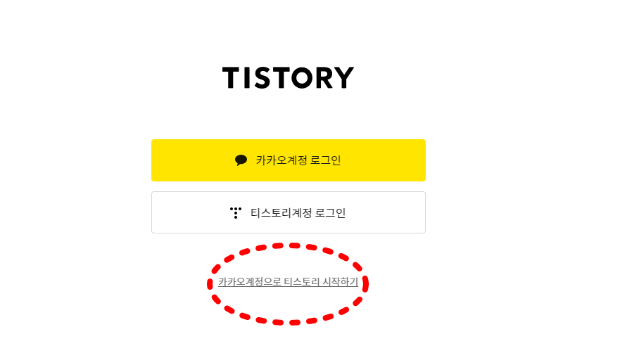 이렇게 로그인 화면에서 '카카오 계정으로 티스토리 시작하기'를 클릭을 통하여 , 이런 작업으로 최초로 티스토리 계정을 생성할 수 있게 됩니다.