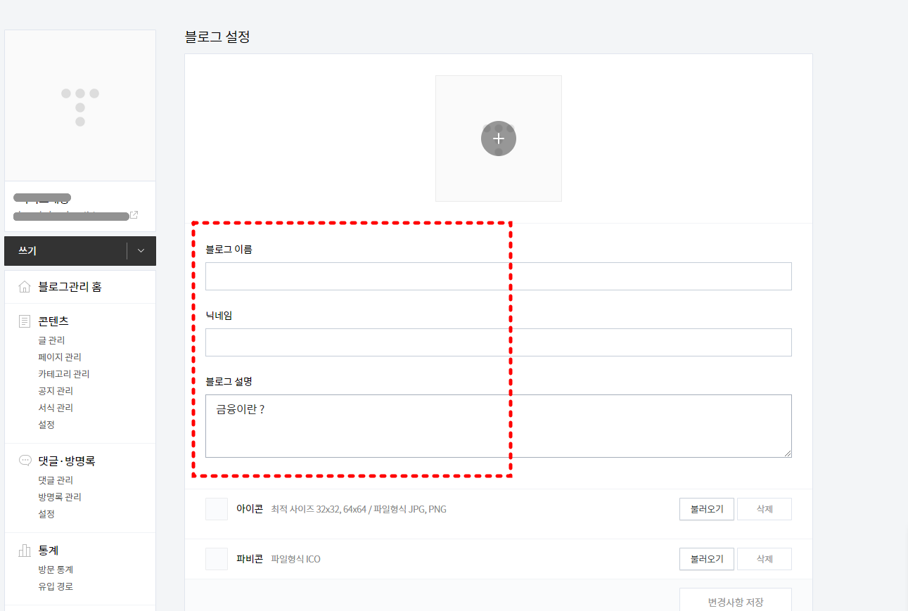여기 '블로그 설정' 메뉴에서는 블로그의 주제나 카테고리를 잘 반영하는 이름을 연계해서 지어 주시는 것이 좋고 , 닉네임이나 블로그 설명란에도 블로그의 주제나 카테고리 특징을 잘 반영하는 단어를 사용하셔서 작성해 주시는 것이 좋습니다.