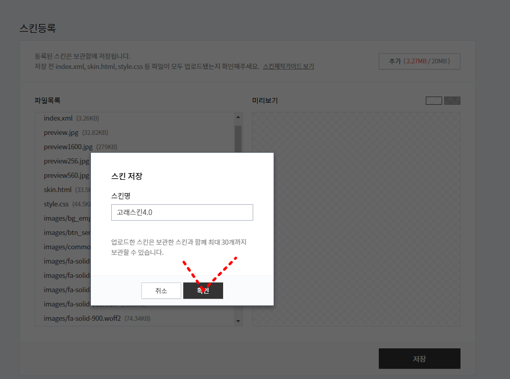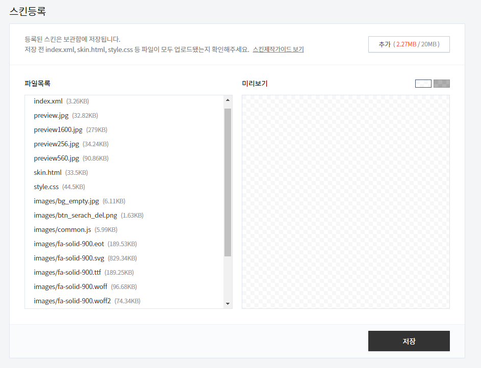 다음으로 '스킨등록' '파일목록' 업로드를 통해서 , 스킨 관련 데이터들을 저장해 주고 , '스킨명' 을 입력해 주어서 기본 스킨설정을 완료해 줄 수 있습니다. 주의하여야 할 사항은 스킨파일 업로드 시에 폴더 안에 있는 파일을 모두 업로드되지 않으면 문제가 될 수 있으니 , 각각의 파일 클릭을 하여서 Shift + control을 통해서 일괄로 드래그해 업로드해주셔야 합니다.