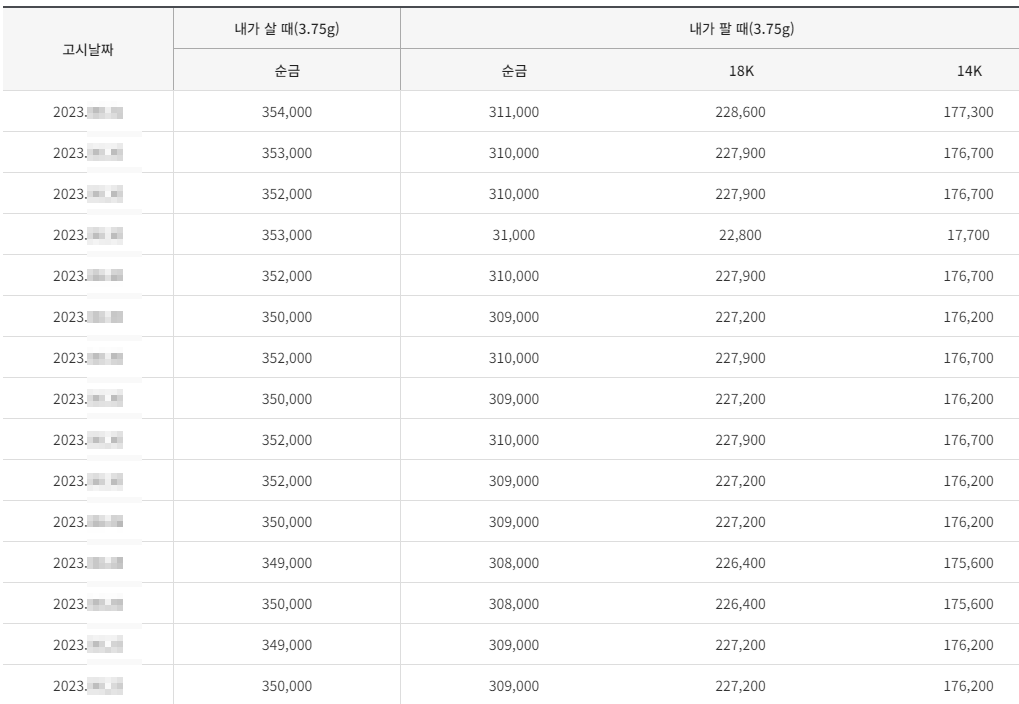 또한, 사이트 상단 메뉴의 금시세 섹션에 가시면 공지일자별 금시세를 보실 수 있으나, 아쉽게도 구매 당시의 순금시세만 보실 수 있습니다. 18K 골드는 사이트 첫 페이지에서 보실 수 있습니다.