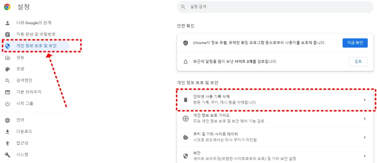 쿠키삭제는 '개인 정보 보호 및 확인'으로 들어가셔서 '인터넷 사용 기록 삭제'를 하시면 됩니다. 인터넷 사용기록 삭제 내용과 항목은 아래와 같습니다.