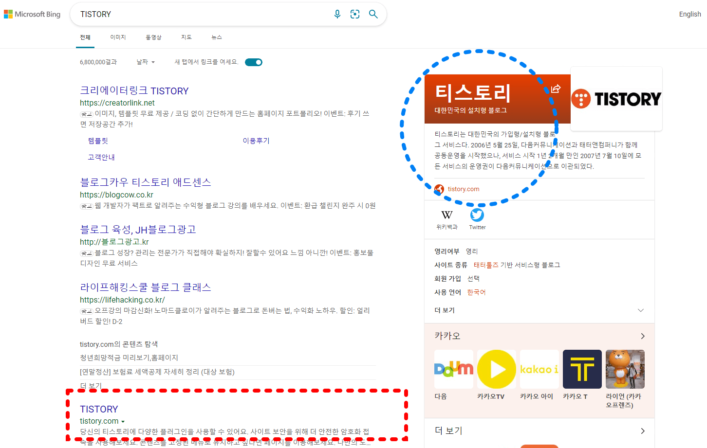 우선 기본적으로 본인이 사용하시는 검색창에서 '티스토리'를 검색해 봅니다. 여기서는 앞서 말씀드린 대로 과거의 복잡하고 번거로운 절차인 '초대장'을 통한 개설이 없어졌으므로 상당히 간소화되었다고 볼 수 있습니다. 티스토리를 검색창에서 검색하신다면 , 아래와 같이 화면에 나오게 됩니다.
