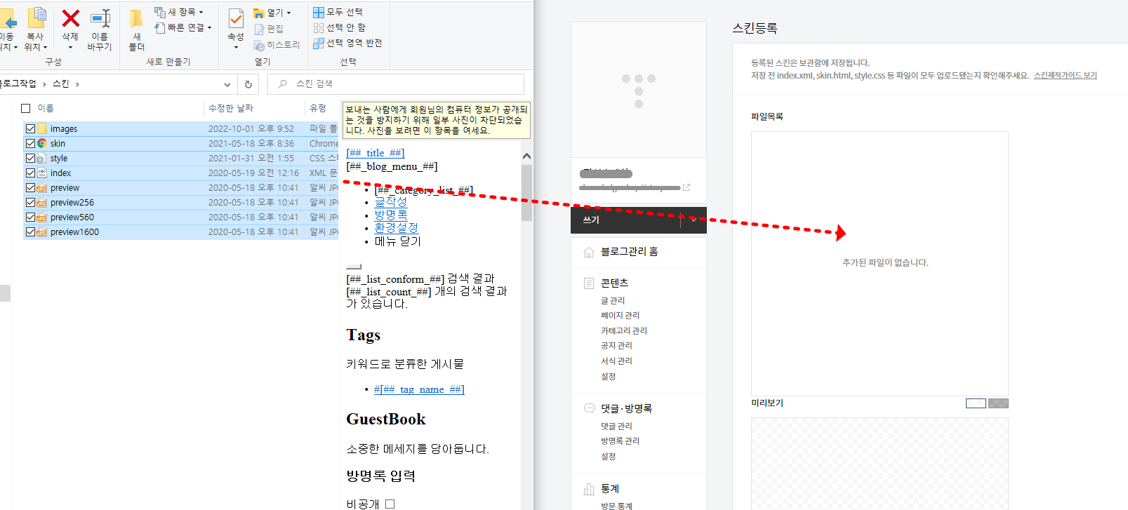 다음으로 '스킨등록' '파일목록' 업로드를 통해서 , 스킨 관련 데이터들을 저장해 주고 , '스킨명' 을 입력해 주어서 기본 스킨설정을 완료해 줄 수 있습니다. 주의하여야 할 사항은 스킨파일 업로드 시에 폴더 안에 있는 파일을 모두 업로드되지 않으면 문제가 될 수 있으니 , 각각의 파일 클릭을 하여서 Shift + control을 통해서 일괄로 드래그해 업로드해주셔야 합니다.
